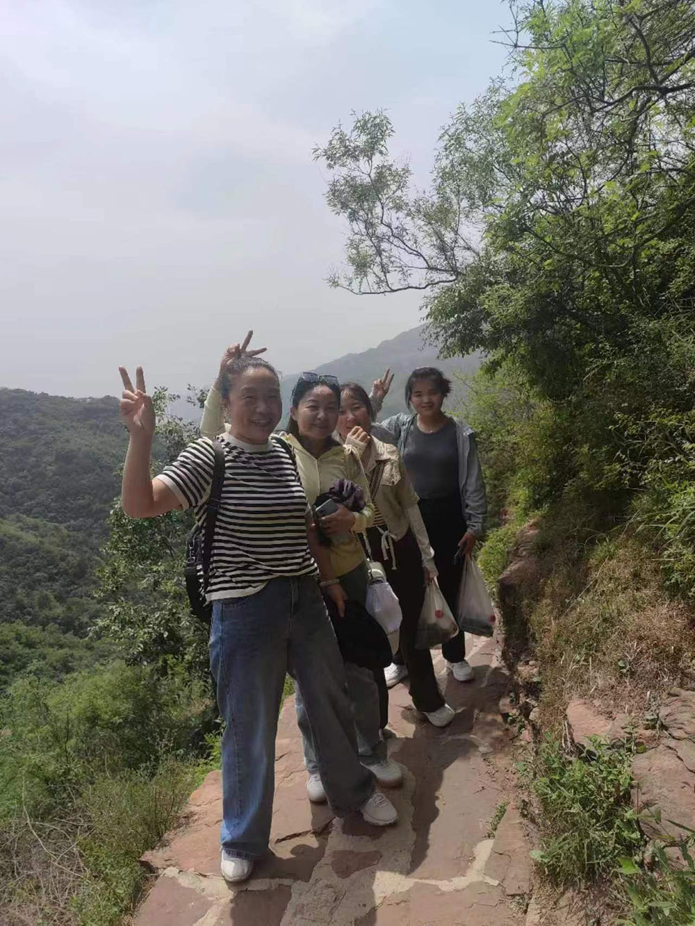 到達(dá)景區(qū)后,大家乘坐景區(qū)內(nèi)小火車來到趙匡胤千里送京娘的青銅雕像前合影留念。撫摸著青銅雕像,品味著這個(gè)凄美的愛情故事,感慨萬千。隨后,大家乘上游船,欣賞京娘湖碧波蕩漾的旖旎風(fēng)光,感受著一線天峰林絕壁的壯美風(fēng)景。到達(dá)碼頭后,大家拾級(jí)而上開始登山。隊(duì)伍分為前鋒、后營、中軍,團(tuán)隊(duì)前后呼應(yīng),協(xié)調(diào)行動(dòng)。上山的路雖然很陡峭曲折,有的路段甚至沒有臺(tái)階,但大家相互鼓勵(lì),相互加油,堅(jiān)持著向上攀登,向上攀登。中午,在山里人家簡單用餐后小憩一會(huì)兒,午后繼續(xù)向山頂發(fā)起沖鋒。每當(dāng)大家疲憊至極時(shí),就停下來休息一下,吹著清爽怡人的山風(fēng),回眸走過的山路,又是一番別樣的風(fēng)景,一身的疲憊和勞累一掃而光。短暫休息后,大家繼續(xù)向上攀登,有的員工走不動(dòng)了,落在了后面,大家就扶一把,拉一把,幫助他們跟上隊(duì)伍。在大家的共同努力下,終于成功登上了宋祖峰的頂峰,整個(gè)團(tuán)隊(duì)沒有一個(gè)人掉隊(duì)。特別是車間女工表現(xiàn)的非常頑強(qiáng),體現(xiàn)了不怕苦不怕累、積極向上的精神風(fēng)貌。團(tuán)隊(duì)的一些老員工,還有員工家屬,不管是老人還是孩子,都表現(xiàn)的很好,堅(jiān)持到了最后,站上了峰頂。